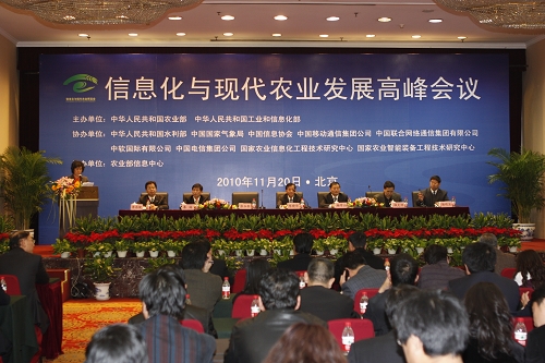 据悉,本次峰会是在2010信息化与现代农业博览会期间举行的。来自全国农业、工业和信息化系统的代表,农业专业技术人员和技术推广工作者,农业教学科研单位,以及电信运营商、IT企业、信息服务商、工商企业代表等500人参加了会议。
